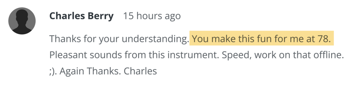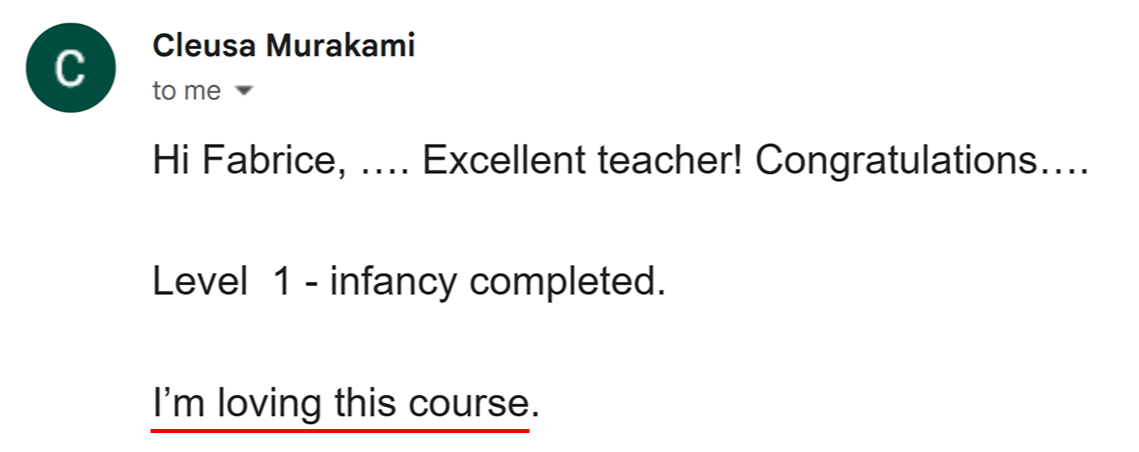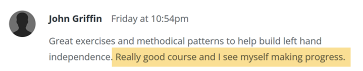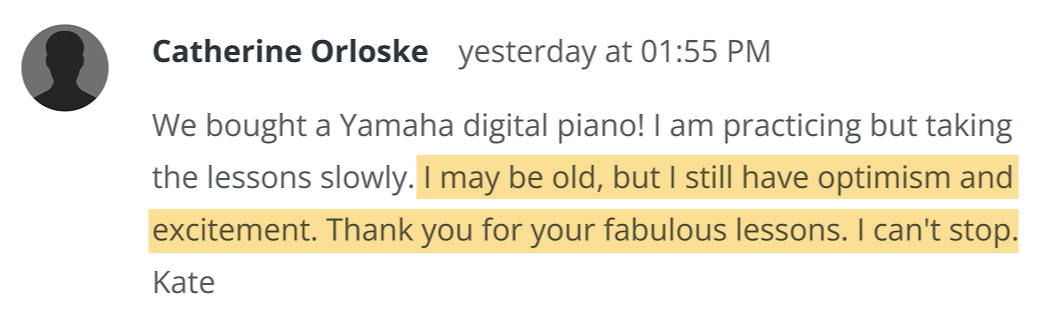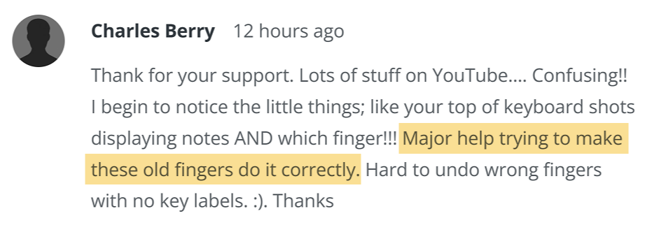 "I started piano during lockdown but got stuck as soon as both hands were involved. Didn't use the piano much after that. I came across your videos and decided to give it a try (I think this was my very last try to learn piano). I started making progress with coordinating my hands pretty quick. It was your step-by-step method for me ... in every step I knew exactly what to do next, thank you Fabrice!"